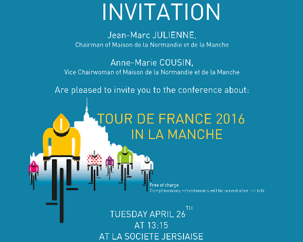 Pour l’occasion, Jean-Francois Le Grand, Président de l’Association du Grand Départ du Tour de France 2016 Manche-Normandie, et Paul-Vincent Marchand, directeur de l’Association du Grand Départ du Tour de France 2016 Manche-Normandie, viendront à Jersey afin d’animer cette présentation.