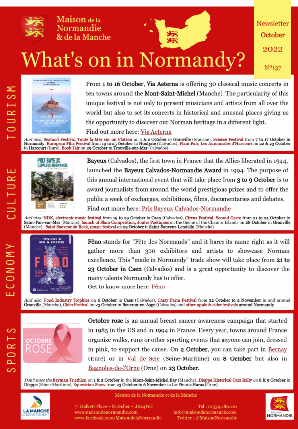 We are very happy to share with you our monthly newsletter about events in Normandy and one event in Jersey happening this weekend!