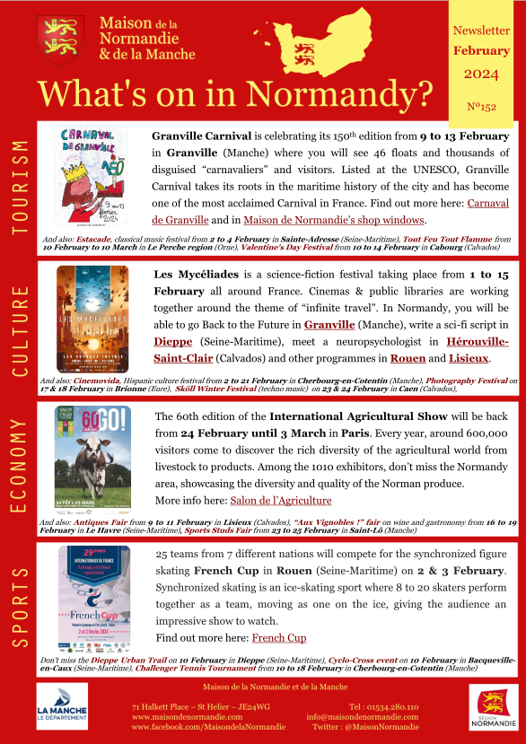 If you are going to Normandy (and a bit further) this February, click on the image on the left or right here to discover the main events happening in our beautiful region.