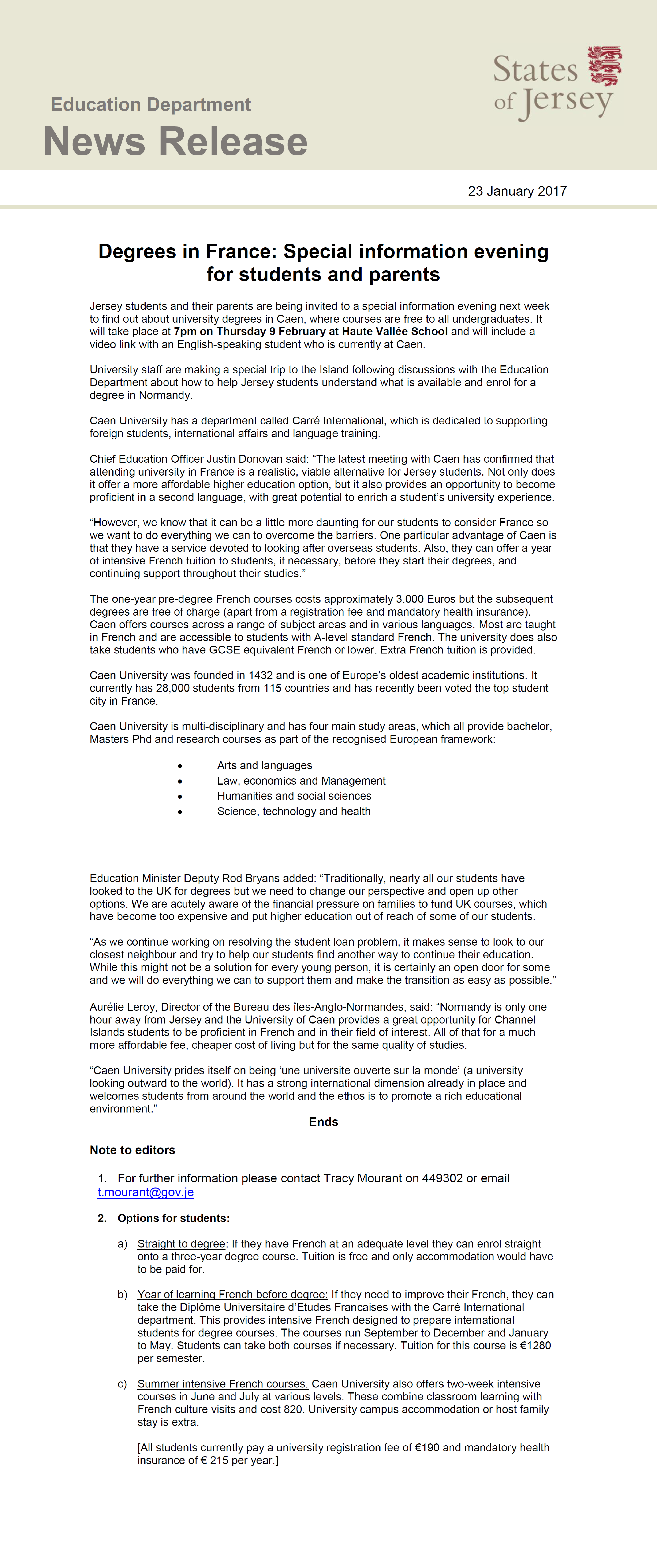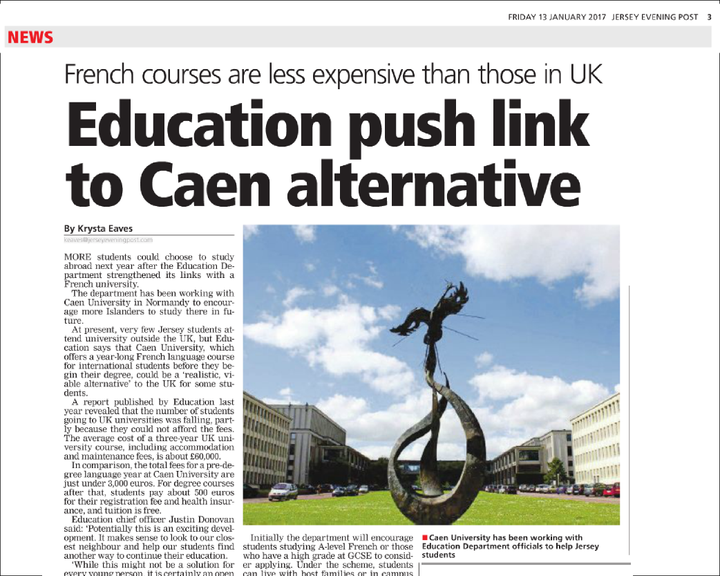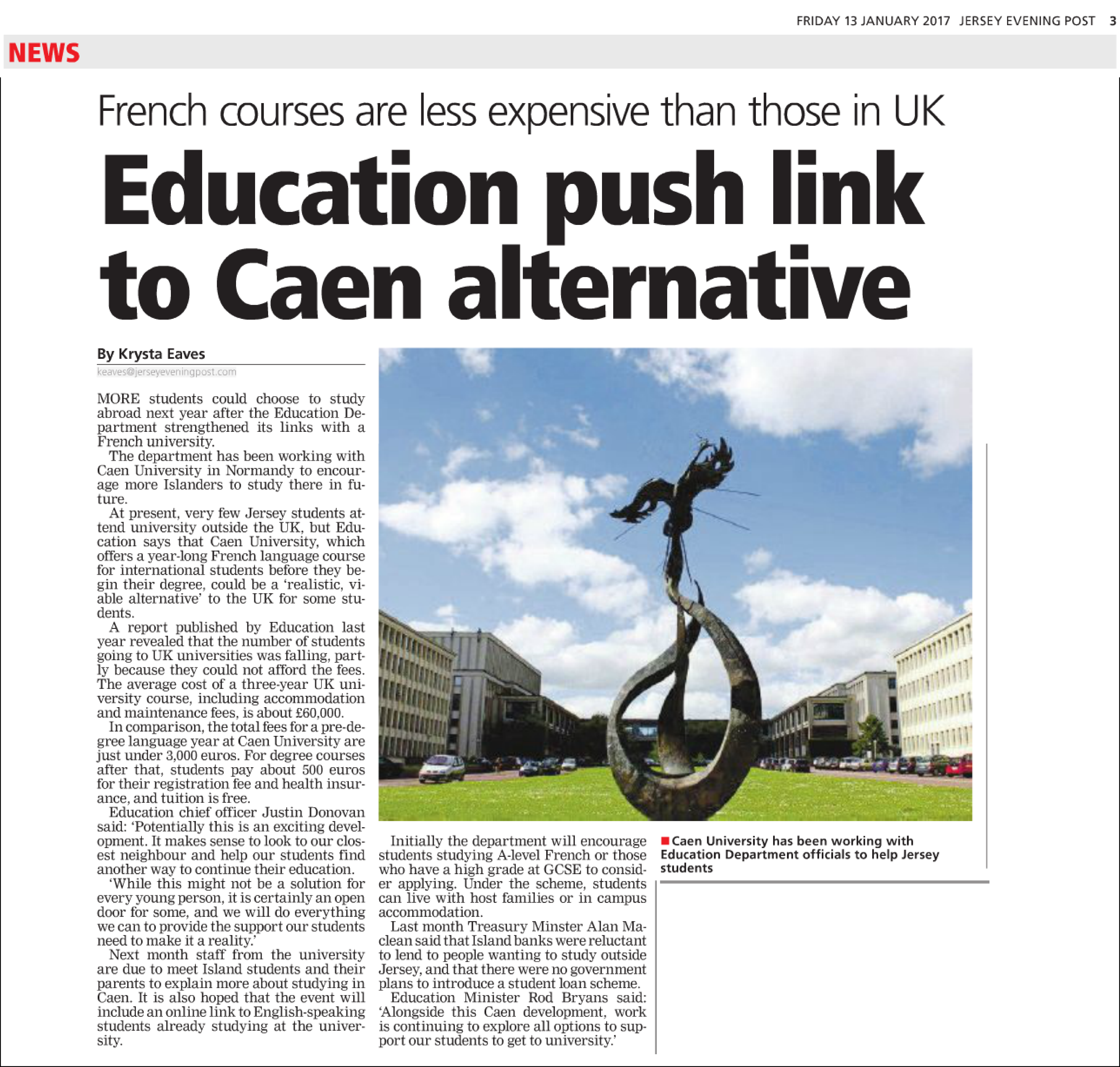The Education Department and the Université de Caen (Normandy) are working closely to give Jersey students the opportunity to study in Normandy, learn more about the program during a special information evening on 9 February.