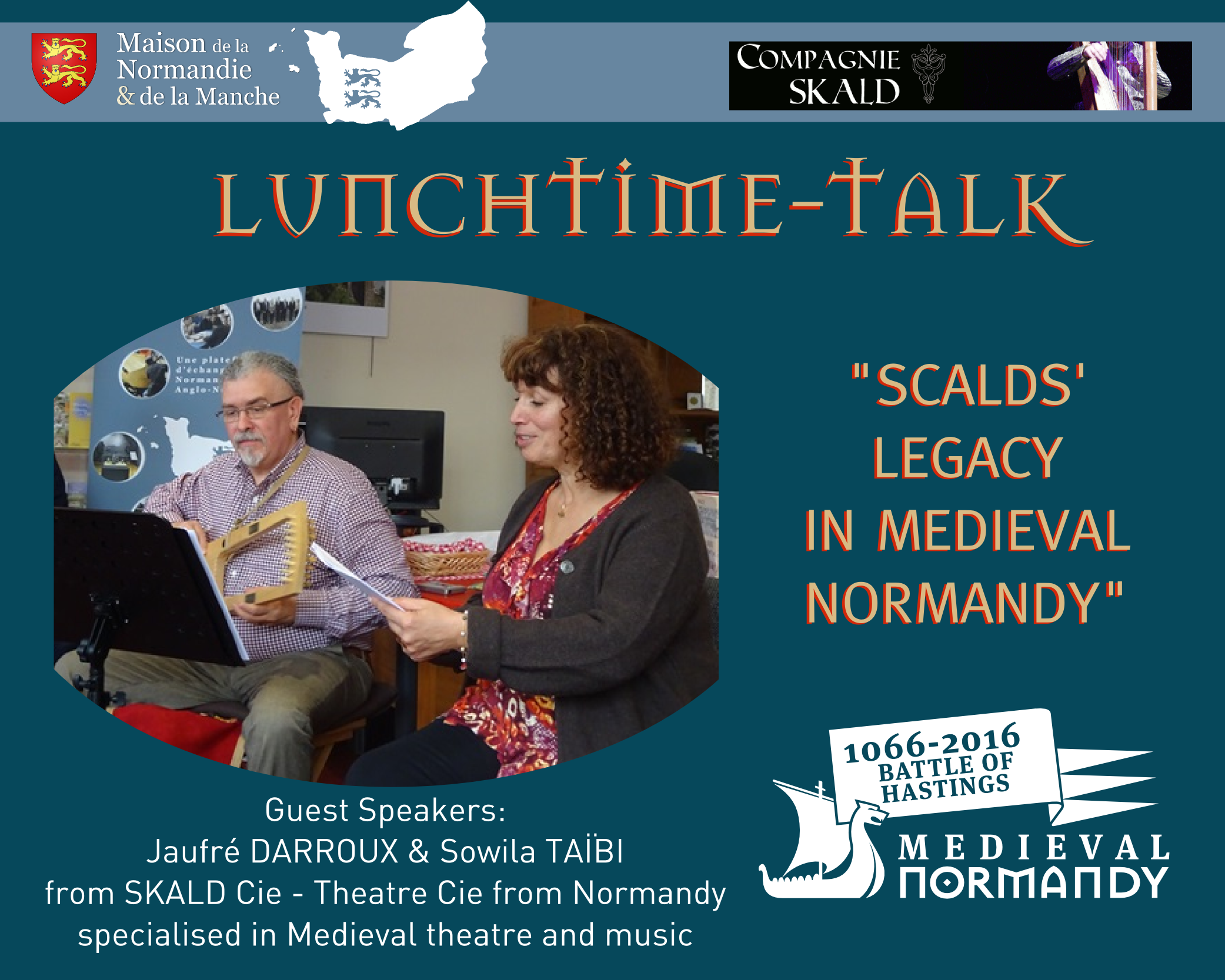 Thursday 20th October, we had the pleasure to welcome Sowila Taïbi and Jaufré Darroux from the Norman theatre Cie SKALD. They gave a very powerful and enlightening talk about the Scandinavian bards (scalds) and how their art lived through Medieval Normandy and beyond! They also enchanted the audience while performing songs and music based on Wace’s Roman de Rou and allowed us to discover more about the mesmerizing art of the scalds.
